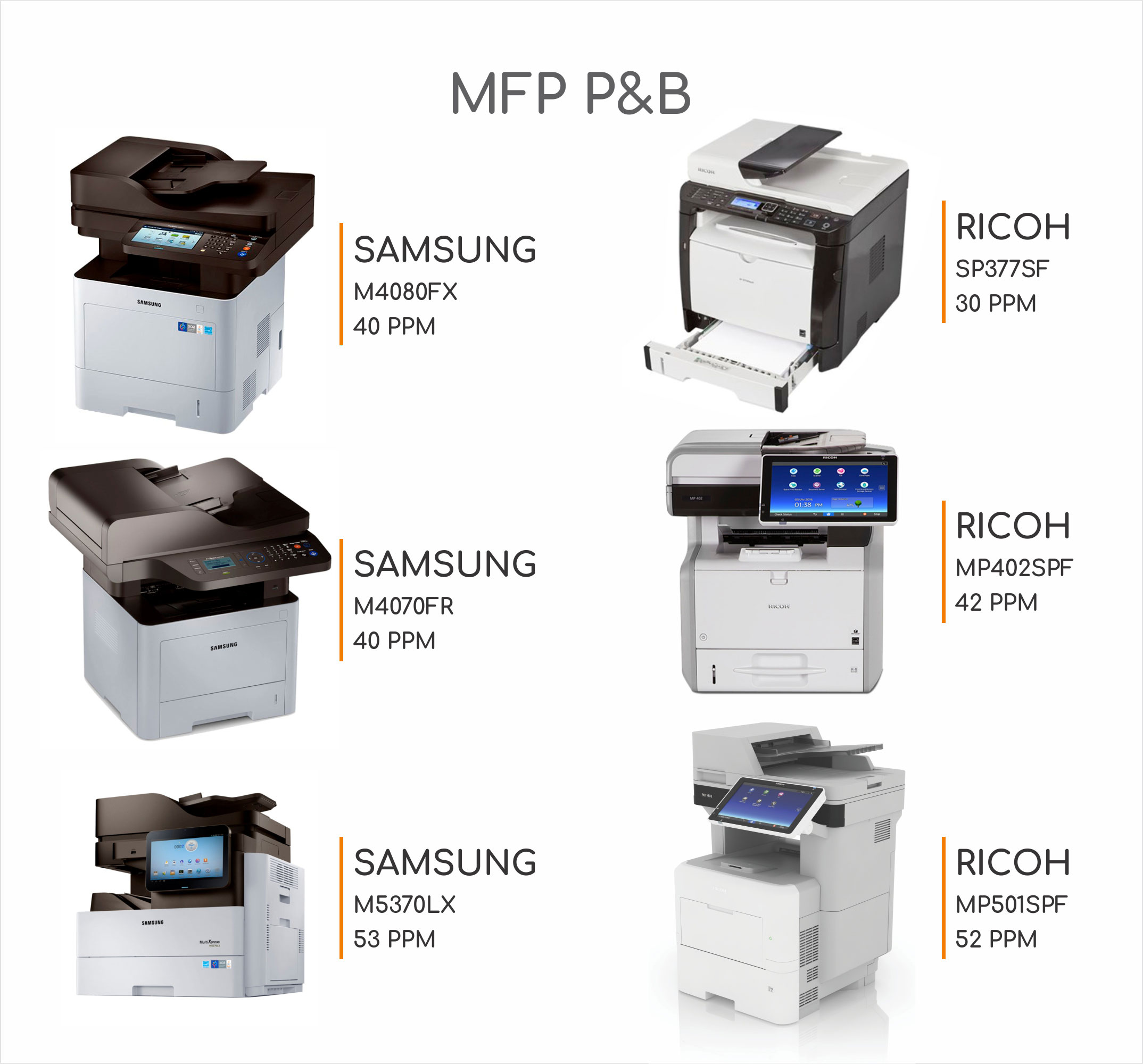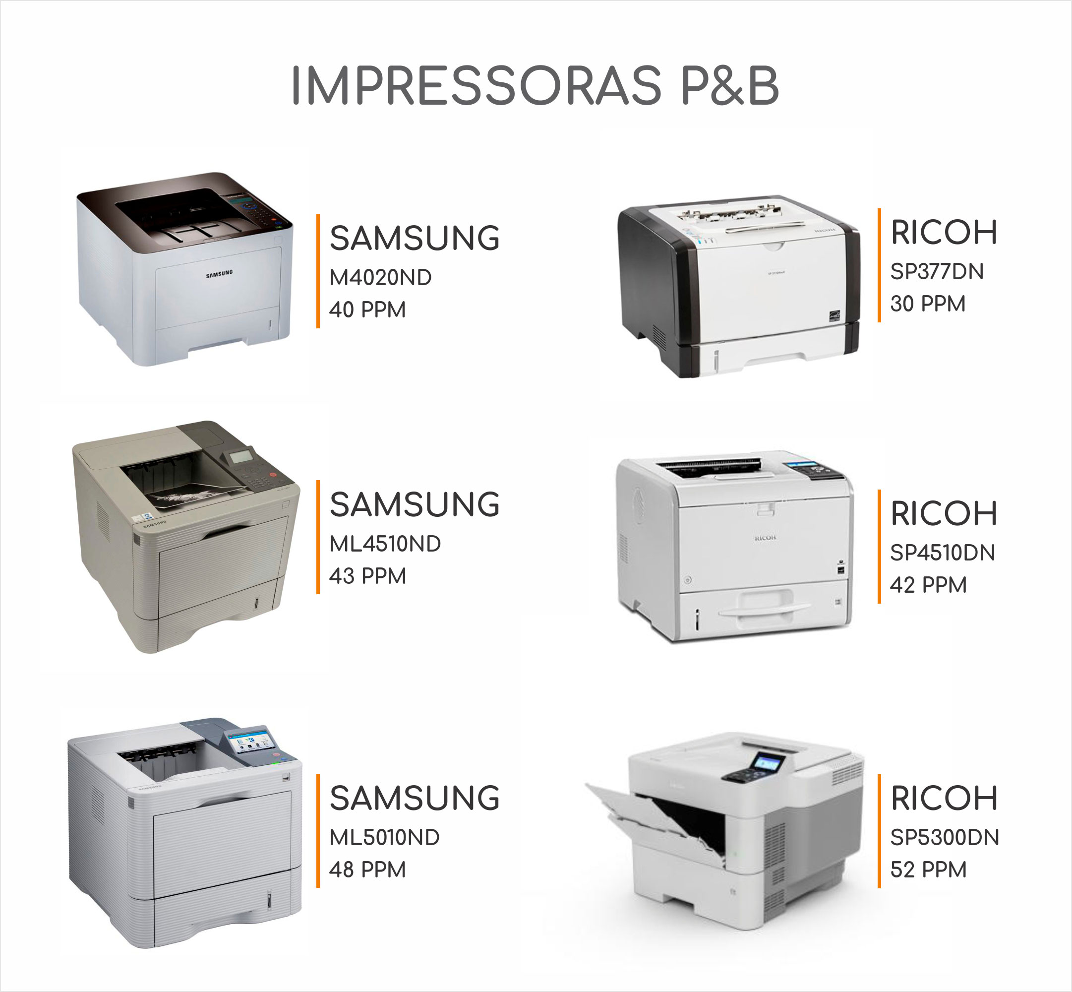 As soluções em preto e branco oferecem agilidade e alta produtividade para quem necessita realizar impressões e cópias monocromáticas com qualidade excelente.